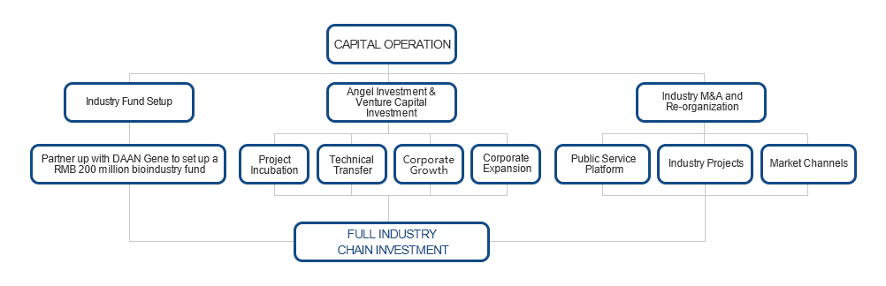 The Company sets up industry funds for full industry chain investments. Angel investment, venture capital investment, merger and acquisition and other approaches have been adopted to support project incubation and technical transfer for corporate growth and expansion. A bioindustry cluster is built through capital operation to accelerate corporate growth. The Company has further partnered up with DAAN Gene to set up a RMB 200 million bioindustry fund.