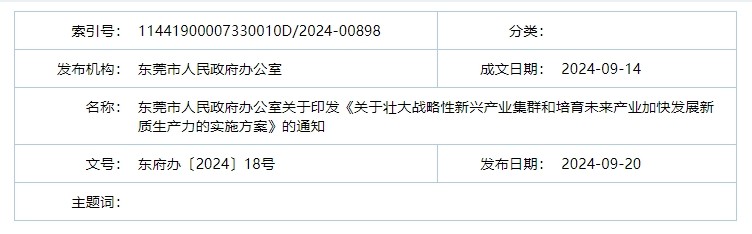 東莞市人民政府辦公室關(guān)於印發(fā)《關(guān)於壯大戰(zhàn)略性新興產(chǎn)業(yè)集群和培育未來產(chǎn)業(yè)加快發(fā)展新質(zhì)生產(chǎn)力的實施方案》的通知